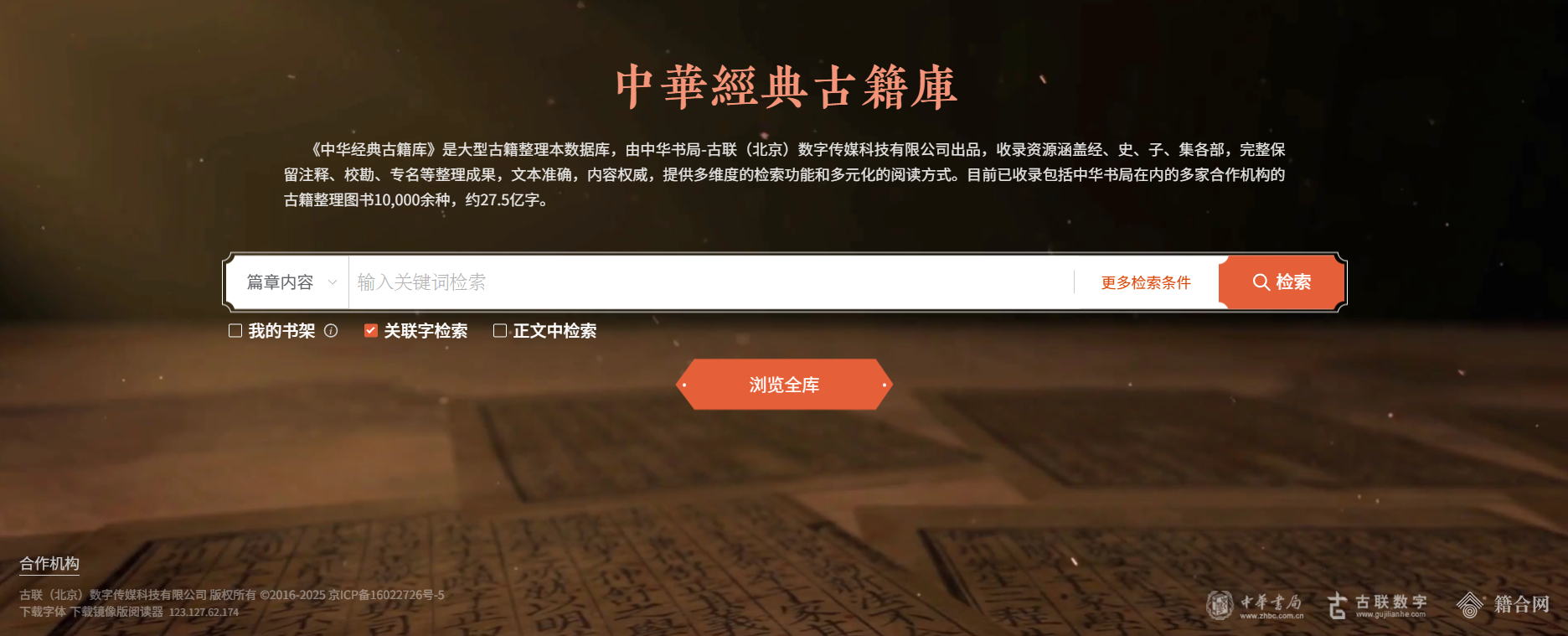 “籍合网”是国内首款古籍整理与数字化综合服务平台,由中华书局下属古联(北京)数字传媒科技有限公司负责建设和运营。“籍合网” 旗下整合了多种古籍类数字产品。《中华经典古籍库》是目前正在运营的重点产品。其资源以中华书局整理本古籍图书为核心,同时涵盖多家专业出版社的古籍整理成果。